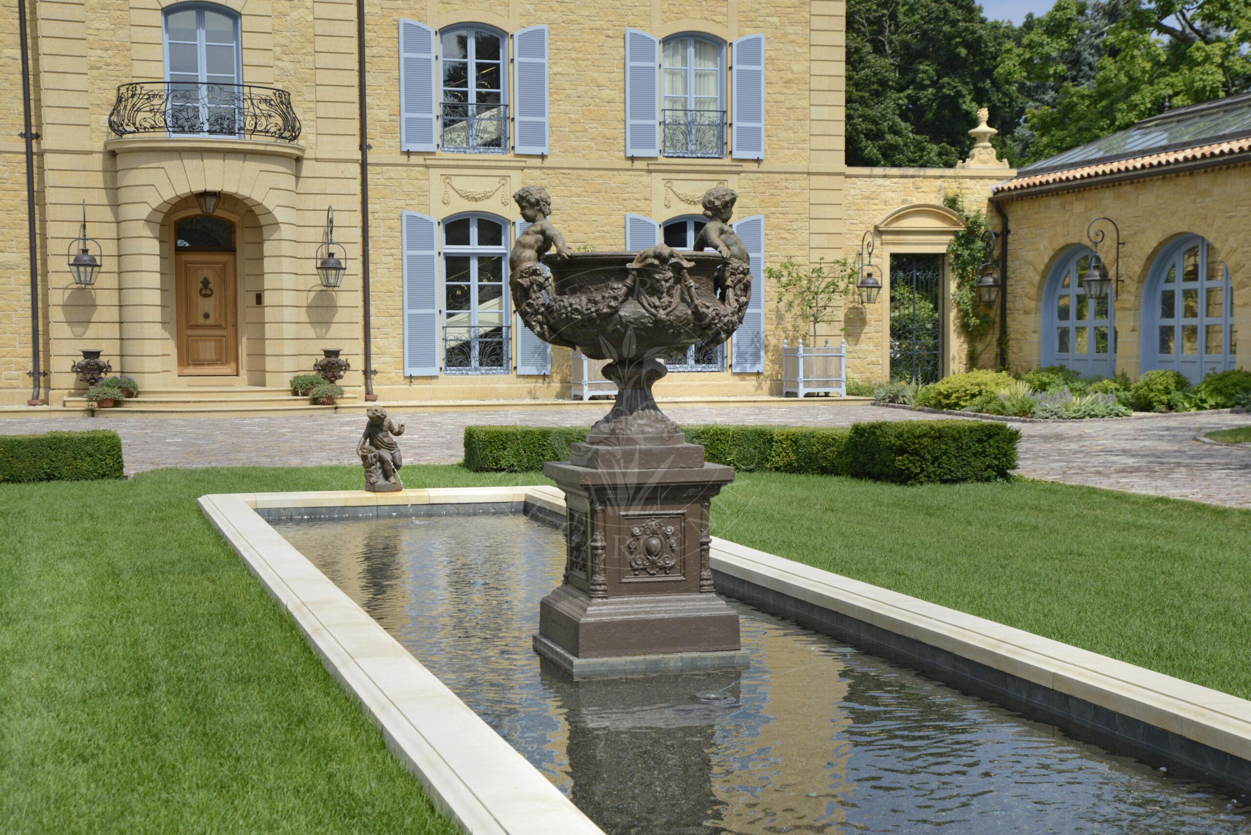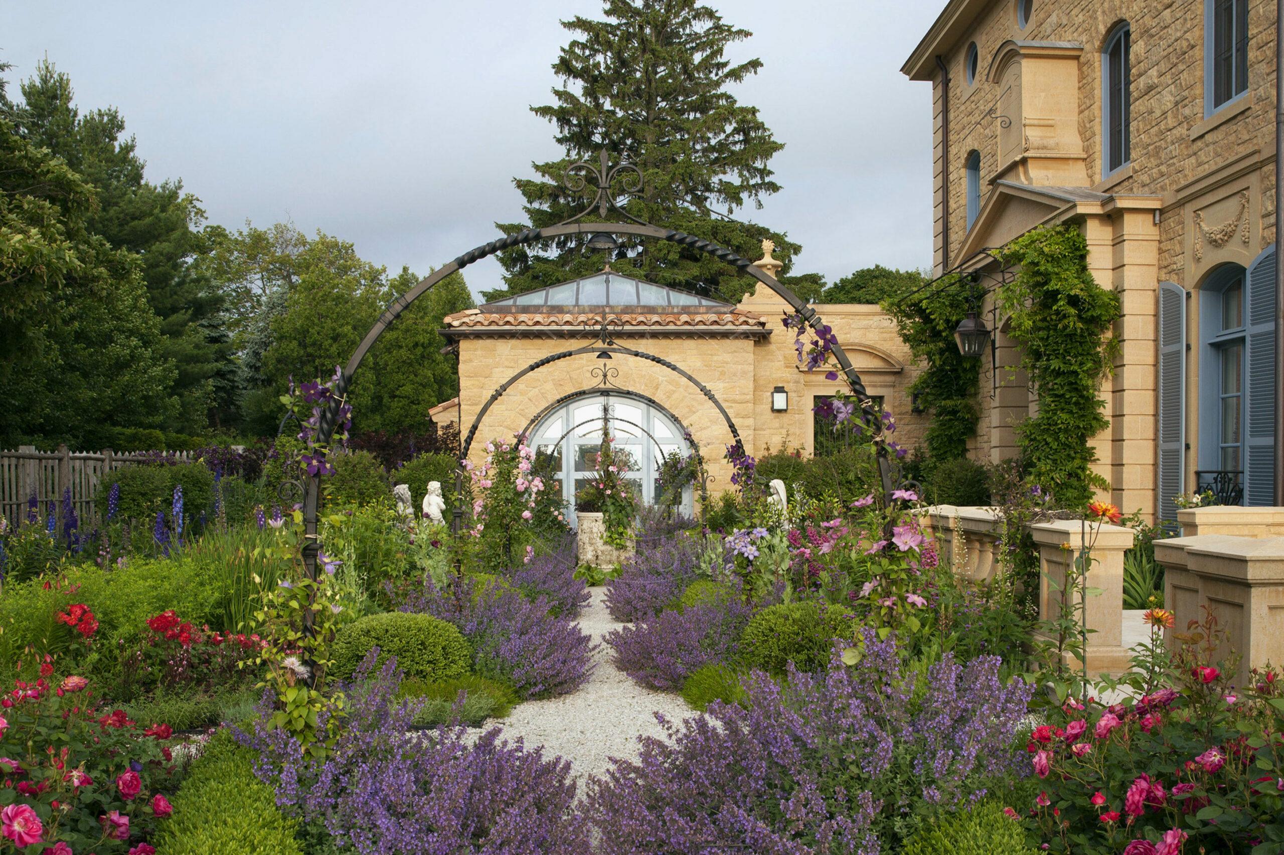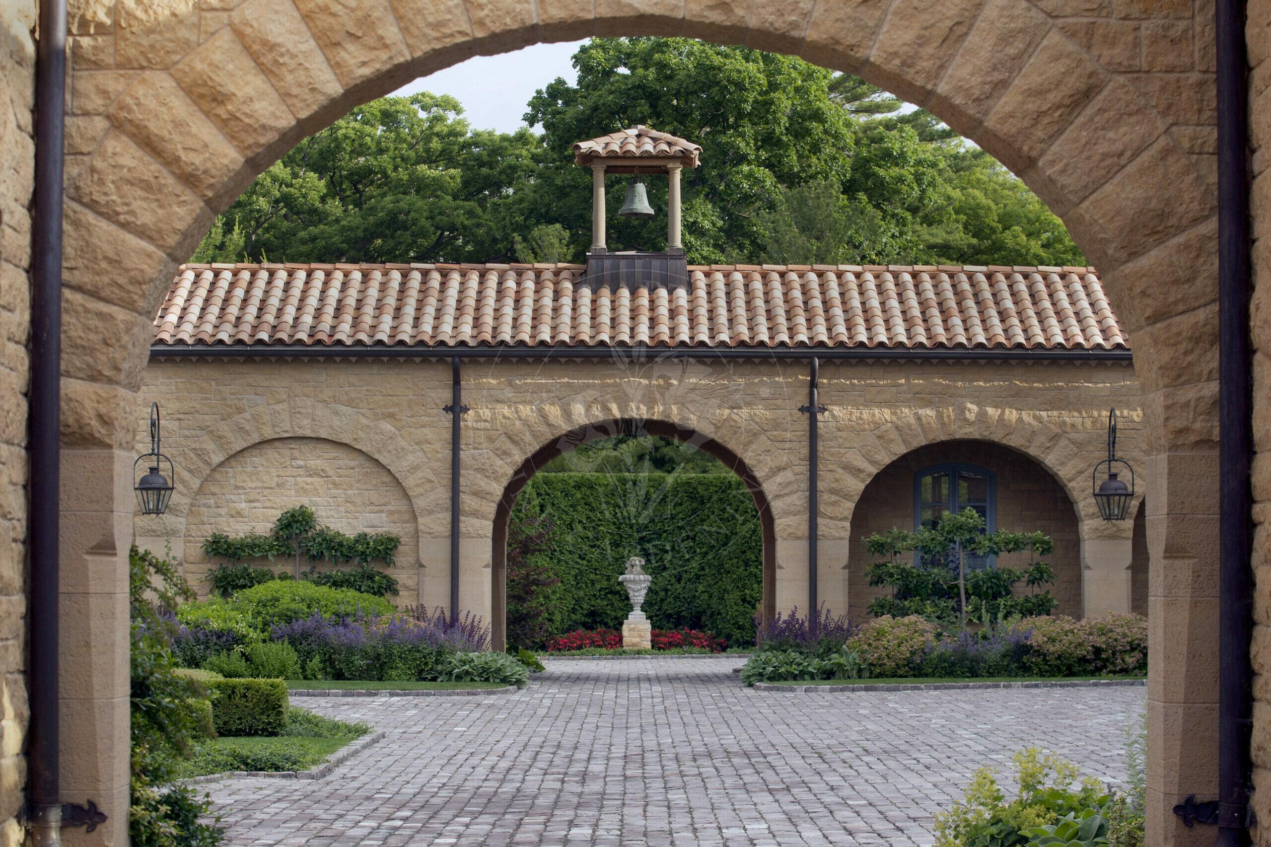 The entry court encapsulates a serene lawn with a reflecting pool on axis with the front door while arches of the garden house wings create a cross-axis that frames long views of statuary. The formal terraced gardens, inspired by the sea, link the estate with sinuous, wave-form hedges and a central axial path of crushed sea shells. The garden overflows with plants common to classic French gardens – peonies, roses, clematis, iris, and lavender. As with French Mediterranean tradition, the formality around the home dissolves into a naturalistic planting style as the garden nears the wildness of the bluff and lake beyond.