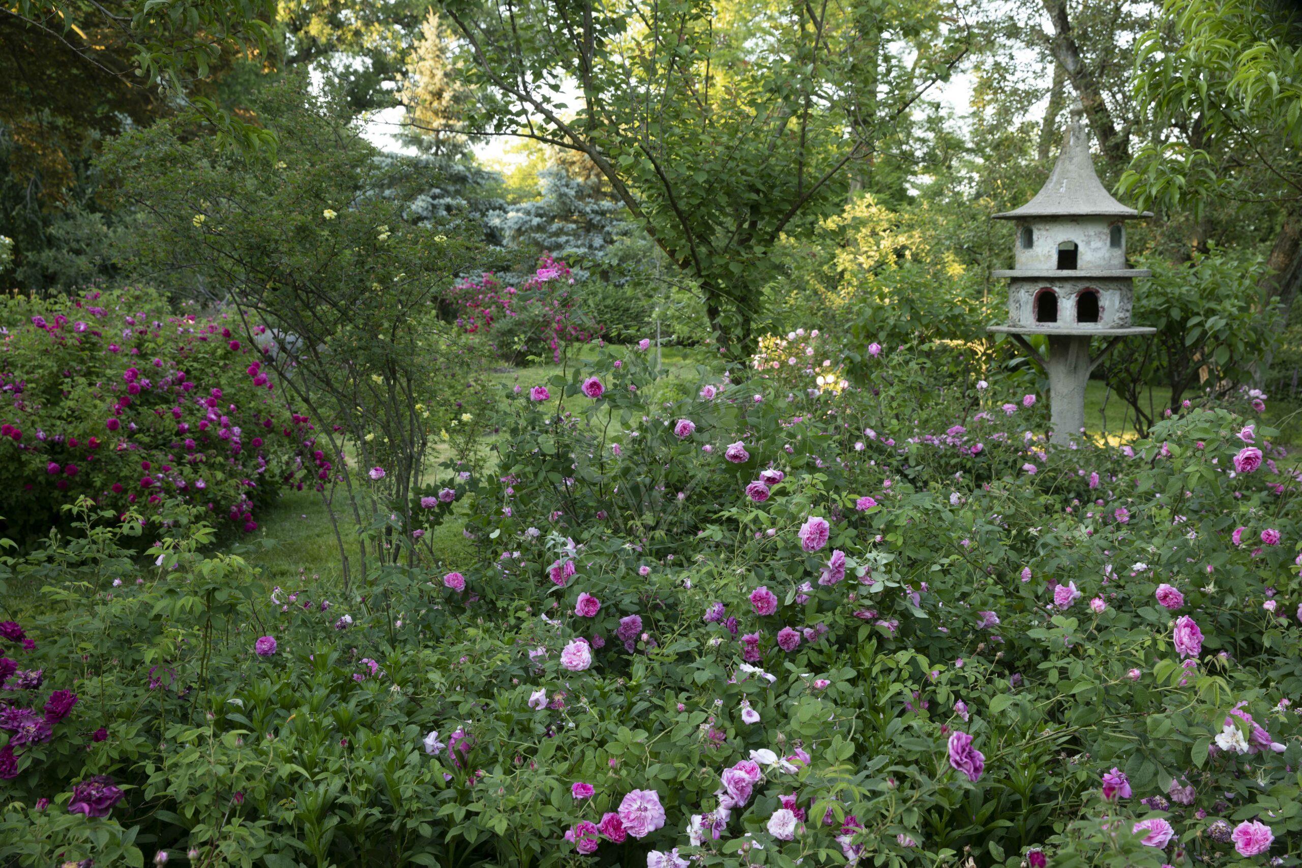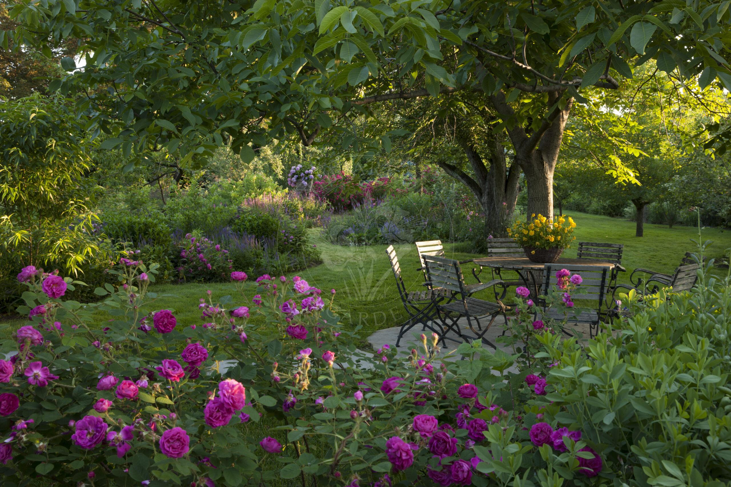 Craig asked his mom for her favorite varieties of apples, pears, and apricots, and that’s what we planted. Though Theresa is gone, her orchard lives on in our gardens. The collection represents all root propagation by our own Deanna Buvala, and consists of recommended old varieties appropriate to thrive in our climate zone. The stunning rose collection consists of Rugosa, Centifolia, Bourbon, Gallica, Hybrid Perpetual, and many more roses highlighted and glorious in June! A sight to be seen, the garden is beautiful in spring as well, with fruit tree blossoms and naturalized Narcissus, Scilla, and Camassia blooms abound.
